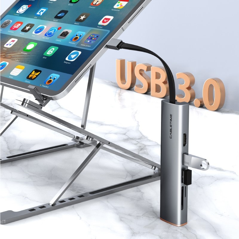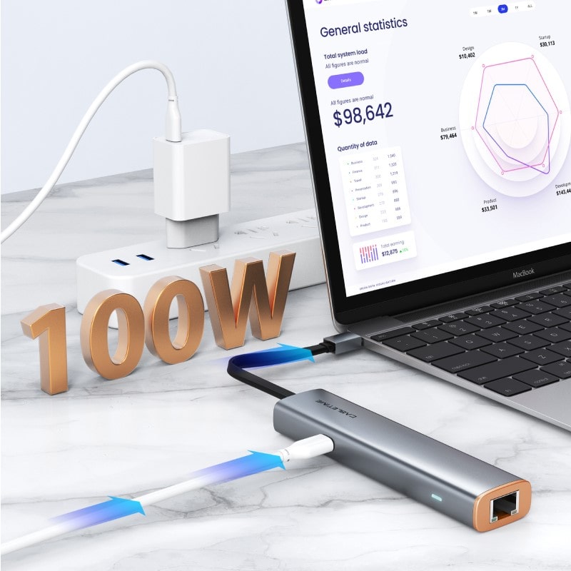 Zorg voor snel en stabiel internet via de Ethernet poort van de 7-in-1 hub. Ideaal voor situaties waar wifi niet stabiel of erg traag werkt, zoals in hotelkamers. De RJ45-poort kan uw internetsnelheid identificeren en zal zich automatisch aanpassen aan de juiste snelheid. (10, 100 of 1000 Mbps).
